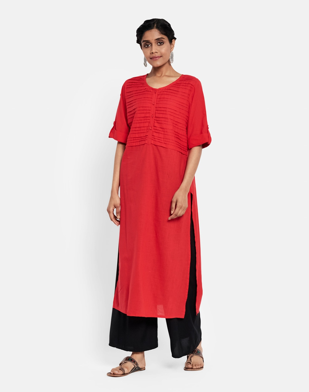 This long kurta is made of fine cotton slub fabric. It has a round neck with placket, three-quarter sleeves, and straight hem. You can style this kurta with jeans or churidar leggings for a casual look.
